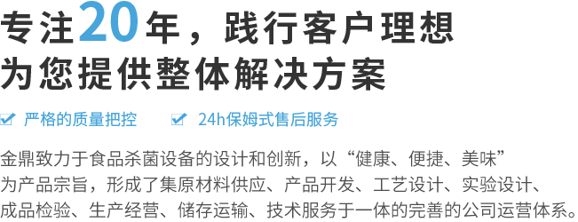 公司是集食品殺菌設備的設計研發、生產制造、營銷服務于一體的專業運營商,已經形成了集原材料供應、產品開發、工藝設計、實驗設計、產成品檢驗、生產經營儲存運輸、技術服務于一體的完善的公司運營體系。